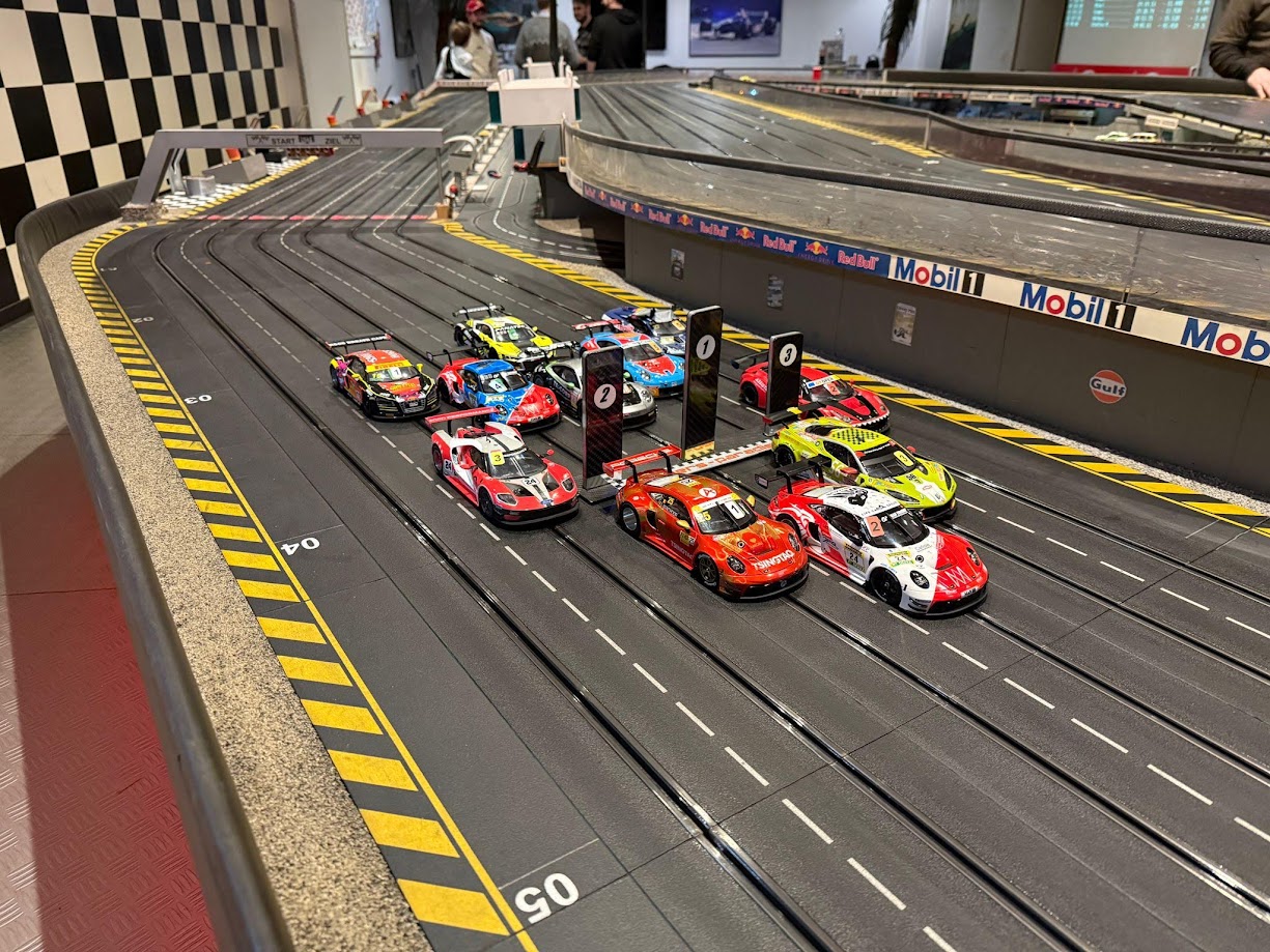 Das Qualifying: Alle Augen auf den Fahrer und sein Slotcar! Die Neuzugänge Volkan und Mikel haben für ihr erstes Zeitfahren zwei tolle Zeiten setzen können. Eine 14,265s mit Volkans Porsche 911 RSR (991) und eine 13,829s von Mikel im Red Bull-Lamborghini waren eine beeindruckende Leistung – jedoch reichte es noch nicht für die bereits erfahrenen Fahrer, die beiden belegten den 13. und 12. Startplatz. Thomas beeindruckte das Umfeld nicht nur mit seiner einzigartigen Corvette C8.R, er überraschte alle mit einer interessanten Strategie: Eine „langsame“ 13,825s lässt ihn auf die zweite Startgruppe zurückfallen. Aber das wars noch lange nicht! Simon setzte seinen Audi R8 LMS auf den 10. Platz, knapp zwei Zehntel hinter Abu, welcher den Vorgänger an den Start gebracht hat. Wiederum zwei Zehntel vorne platzierte sich der bekannte „Temu-Porsche“ von Klaus, der 992 lag sehr stabil. Die erste Startgruppe komplettierte Oliver mit seinen Ferrari 458 GT3, mit dem er heute nicht den Speed gefunden hat. Er fuhr eine 13,064s und startete von sieben. Martin (13,043s) konnte sich die sechste Startposition sichern, jedoch hob sich das Feld zeitlich nochmals: Holger sein Ford GT nahm mit einer Zeit von 12,670s den 5. Startplatz ein, drei Tausendstel hinter Bernhards 911 RSR (991) – ganz knapp! Noch einmal 5 Tausendstel davor: Julian mit seinen neuen Porsche 911 GT3 R. Nach seinen ersten Lauf im Vorjahr hat er bereits viel Erfahrung sammeln können, der 911er lag ihm perfekt. Steffen fuhr eine Zeit von 12,426s ein und nahm somit den zweiten Startplatz ein. Mit einer 12,264s belegte Nico die Pole-Position – sein GT3 R gab ihn die besten Bedingungen für den Start.